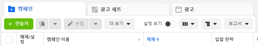 페이스북 광고는 캠페인 - 광고세트 - 광고 단으로 구성되어 있다. 도식으로 나타내 보자면 아래의 표와 같은 형태이다. 캠페인 1. 광고세트 1-1. 광고 1-2. 광고 2. 광고세트 2-1. 광고 2-2. 광고 캠페